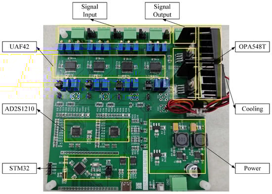Figure 16 shows the hardware circuit board of the angular measurement system. The excitation signal is connected to the stator side of the upper cover through a twisted and shielded pair of wires, while the output terminals of the inductosyn are connected to the input ports of the UAF42 filter circuit. The PCB is divided into three functional sections: a digital section, an analog section, and a power supply section. These sections are connected through 0 Ω resistors to achieve single-point grounding.