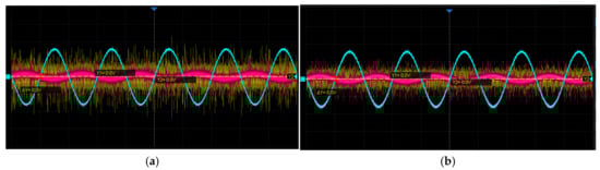 Since the original induced signals generated by the round inductosyn are extremely weak, twisted-pair shielded cables are used for signal transmission to minimize interference during propagation. This configuration effectively exploits the differential nature of the signals and enhances their noise immunity. The induced signal amplification module amplifies the two millivolt-level signals to 3.2 Vpp, ensuring that their phases and peak amplitudes remain nearly identical, with a phase deviation of less than 44° from the excitation signal. The coarse and fine channels operate independently but follow identical processing procedures. The sine and cosine induced signals of the coarse channel were selected and measured using an oscilloscope, both before and after filtering and amplification, as shown in Figure 18.