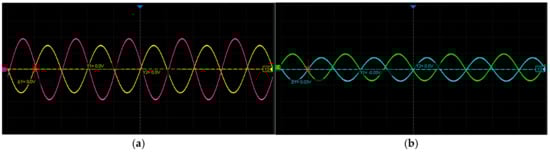 The excitation signal is generated by the AD2S1210 and consists of dual differential sinusoidal waves at 10 kHz with a peak amplitude of 5.9 V. Each channel includes a DC offset of 2.5 V as a reference voltage. As shown in Figure 17, Channel 1 represents the original sine wave output from the AD2S1210, with a frequency of 10 kHz and a peak-to-peak amplitude of 6.8 Vpp, while Channel 2 shows the excitation signal after power amplification, maintaining the same 10 kHz frequency with an amplitude of 7.4 Vpp. A 90° phase shift occurs between the pre- and post-amplified signals, with a slight increase in voltage amplitude but no change in frequency, which is consistent with the theoretical design requirements.