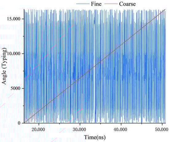 For the dual-channel round inductosyn, the coarse and fine channels have different measurement ranges and resolutions. When readings from both channels are obtained, a data fusion algorithm must be implemented to combine the two. The coarse channel provides the primary positional reference, while the fine channel refines the angular measurement with higher precision. This approach allows the system to achieve both a wide measurement range and high angular resolution, fully utilizing the characteristics of the dual-channel round inductosyn. In this study, the coarse channel has a pole-pair number of Nc = 1, and the fine channel has Nf = 180, meaning that the fine channel completes 180 electrical cycles within one mechanical revolution of 360°. By combining the two channels, high-resolution angle measurement can be achieved without ambiguity.