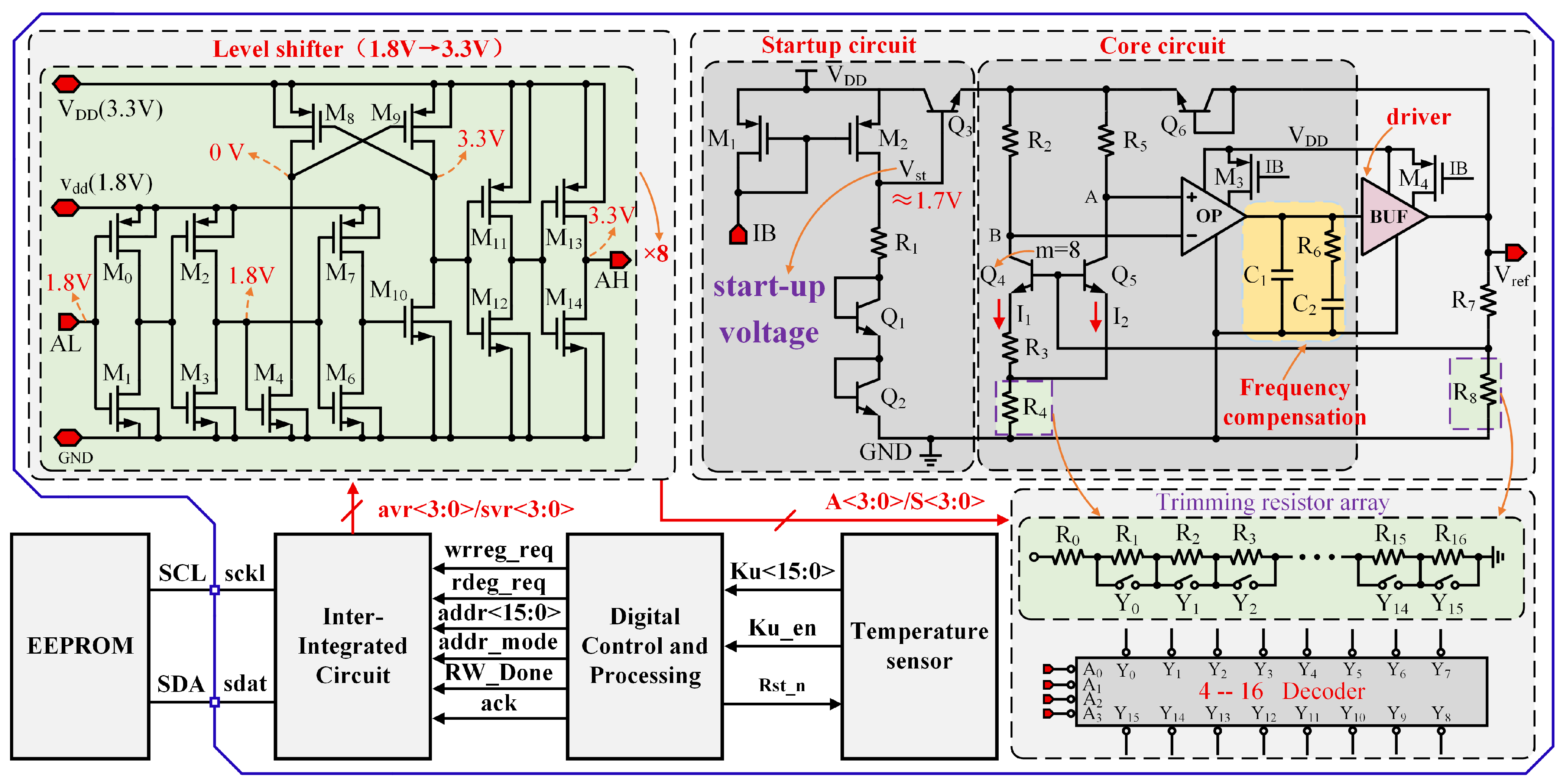 - Chen, E.; Wu, T.; Yu, J.; Yin, L. A High-Precision Bandgap Reference with Chopper Stabilization and V-Curve Compensation Technique. Micromachines 2023, 15, 74. [Google Scholar] [CrossRef]