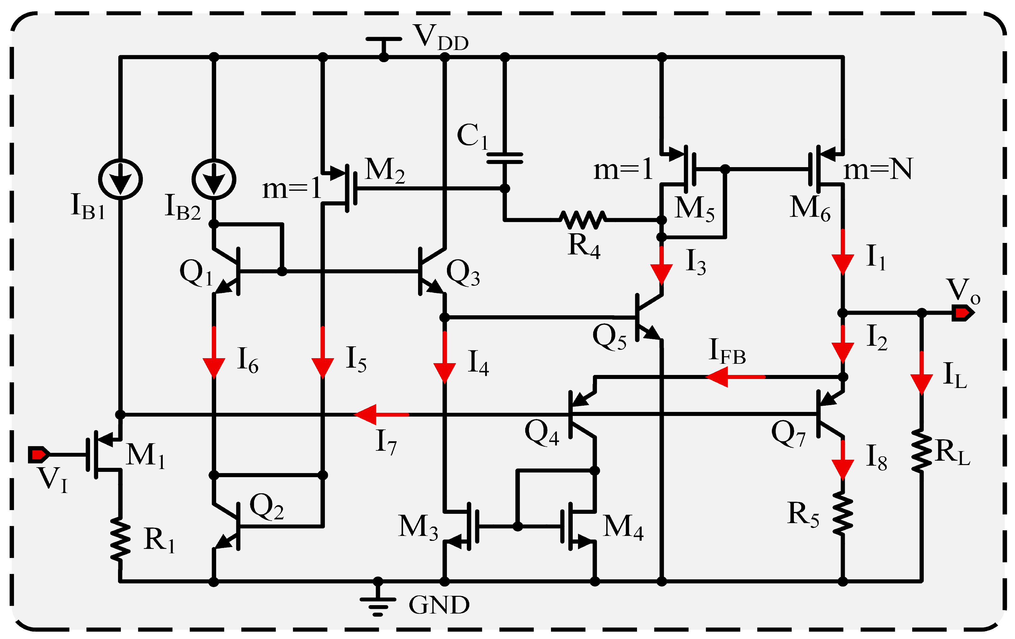 - Khan, A.A.; Palani, R. Analysis and Design of Low-Noise Voltage Regulator with Integrated Single BJT Bandgap Reference up to 10 mA Loads. IEEE Trans. Circuits Syst. II Express Briefs 2024, 71, 2966–2970. [Google Scholar] [CrossRef]