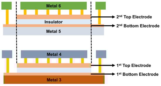 However, metal–insulator–metal (MIM) capacitors, along with inductors, have the disadvantage of occupying a large area. Research is being conducted in two main areas to overcome this limitation. First, increasing the capacitance density involves changing the type or thickness of the insulator [18,19]. Second, various structural design methods for MIM capacitors can be employed to increase the capacitance density per unit area [20,21,22]. The MIM capacitor used in this study is a stacked-type unit, the structural design of which involves vertically connecting two MIM capacitors in parallel to increase the capacitance density per unit area.