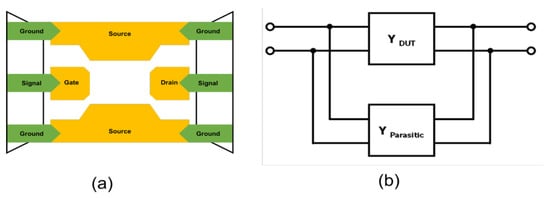 Equation (7) is derived under the same physical and electrical configuration as Equations (4)–(6), and therefore shares the identical GSG probe connection and interconnect topology illustrated in Figure 4a,b. This equation does not correspond to a new schematic or connection diagram; rather, it represents a subsequent algebraic de-embedding step that removes the previously identified parasitic admittance to extract the intrinsic DUT response.