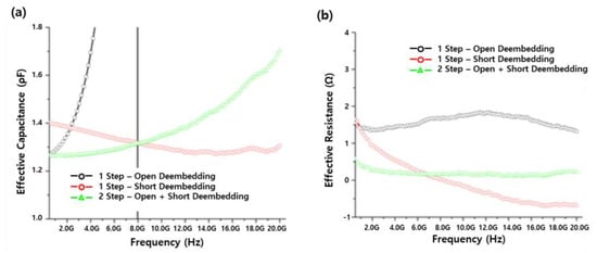 In this study, the two-step de-embedding approach was adopted because the pad dimensions and interconnect lengths of the test structures are electrically short within the measurement frequency range. Under these conditions, transmission-line effects are negligible, and the additional complexity associated with three-step de-embedding using a thru structure provides limited benefit.
