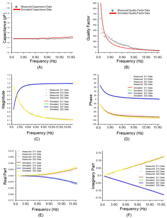 Figure 6 presents the results of analyzing the RF model accuracy of a stacked MIM capacitor for each parameter using the equivalent circuit of a general RF model. The equivalent circuit of a typical MIM capacitor RF model includes the MIM capacitance (CMIM), which acts as a direct capacitor, along with a parasitic inductance (Ls) and resistance (Rs) component occurring in series with this capacitor. Additionally, it was configured with a combination of parasitic capacitance (Cox, CSub) and parasitic resistance (RSub) components occurring in parallel with these series components. Figure 7 shows the corresponding results based on the equivalent circuit of the improved RF model. Figure 7A highlights the degree of agreement with the actual total effective capacitance (Cmim1 + Cmim2) as the sum of the formed MIM Capacitances 1 and 2. The measured value and the extracted simulated value were almost identical. Thus, the accuracy was higher when the equivalent circuit of the general RF model (Figure 7A) was used. The accuracy remained high up to high frequencies. Figure 7B shows high accuracy as the quality factor, which is an important parameter for evaluating the characteristics of stacked MIM capacitors. Figure 7C–F compares the magnitude and phase values of the S-parameter, which can be used to evaluate the accuracy of the model, based on the real and imaginary parts of the Y-parameter, respectively. Excellent accuracy of the model is underscored by the fact that the measured value and the extracted simulated value were almost identical up to a high frequency band. For the Y-parameter, which is more important than the S-parameter in the analysis of capacitor characteristics, a significantly more accurate result was obtained when the equivalent circuit of the improved RF model was used with respect to RF model was used. Based on the analysis of the extracted RF model of the stacked module in terms of the MIM capacitance, quality factor, S-parameter, and Y-parameter, excellent accuracy could be observed, given that the measured values and the extracted simulated values were almost identical up to a high frequency band. Considering these results, stacked MIM capacitors can perform stably in higher frequency bands if a ground shield is included to reduce degradation at high frequencies or if the RF isolation of each stacked MIM capacitor is increased to reduce parasitic capacitance.