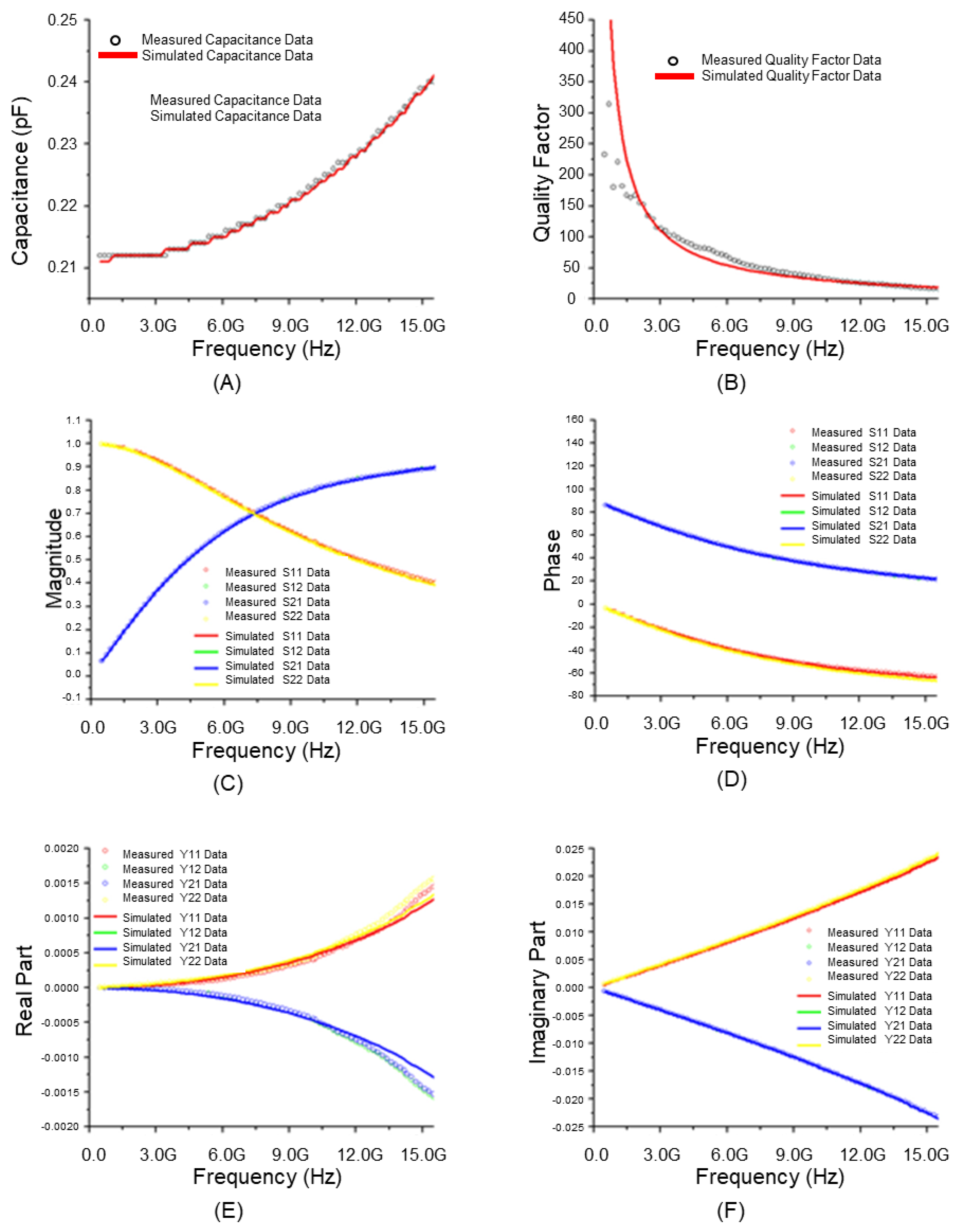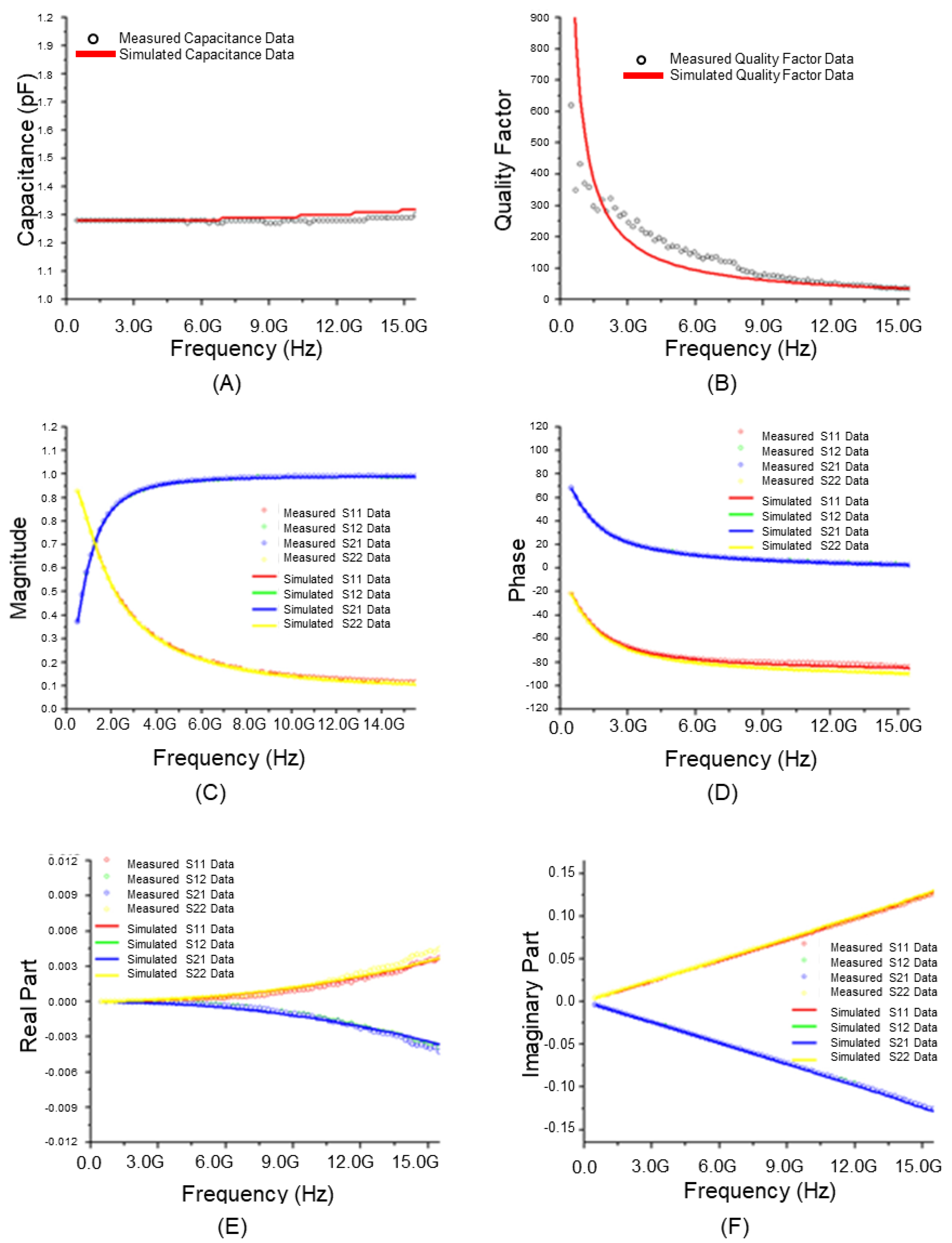 Figure 7. Characteristics of modified RF model of stacked module (10 μm × 10 μm): (A) Total effective capacitance; (B) Quality factor; (C) Magnitude of S-parameter; (D) Phase of S-parameter; (E) Real part of Y-parameter; (F) Imaginary part of Y-parameter.