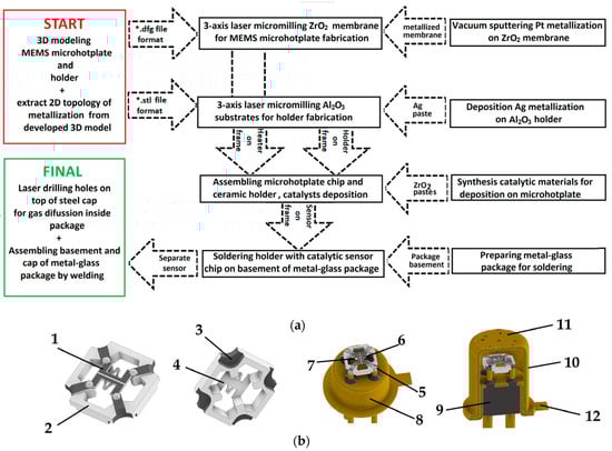 Figure 1. Technological steps used for the fabrication of thermocatalytic sensors: (a) Full flowchart for the fabrication of sensors; (b) 3D model of the thermocatalytic gas sensor in the TO-18 package used for fabrication.