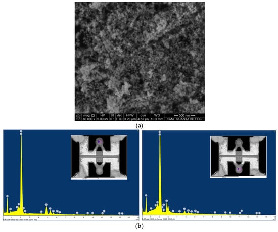 The SEM image and EDS element analysis of catalytic gas-sensitive materials (covered and not covered by Pt and Pd nano species) are shown in Figure 4b. Apart from the elemental compositions, a significant difference is found in the deposition of the two inks (the active and the reference material). The metal catalyst containing ink is better wetted by the organic binder, and therefore, we have a different mass of materials in the two types of inks with similar viscosity. To avoid using overly complex, yet effective, viscosity-related techniques, we used a digital optical microscope during gas-sensitive material deposition, trying to adjust the number of drops to achieve uniform ball diameters. The best result for the drop-by-drop uniformity of the beads (reference and active) is shown in Figure 4. Drying at 150 °C took place between droplet depositions for preventing cracking under the final sintering of formed beads. This was necessary, because the evaporation of organic binders is the main driver of cracking formation on the surface of beads.