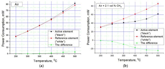 Figure 6. Dependence of the power consumption on the temperature of the active and comparative elements during operation: (a) in clean air; (b) in air mixture with methane, which gives 42% LEL (100% LEL is a concentration of 5% methane).