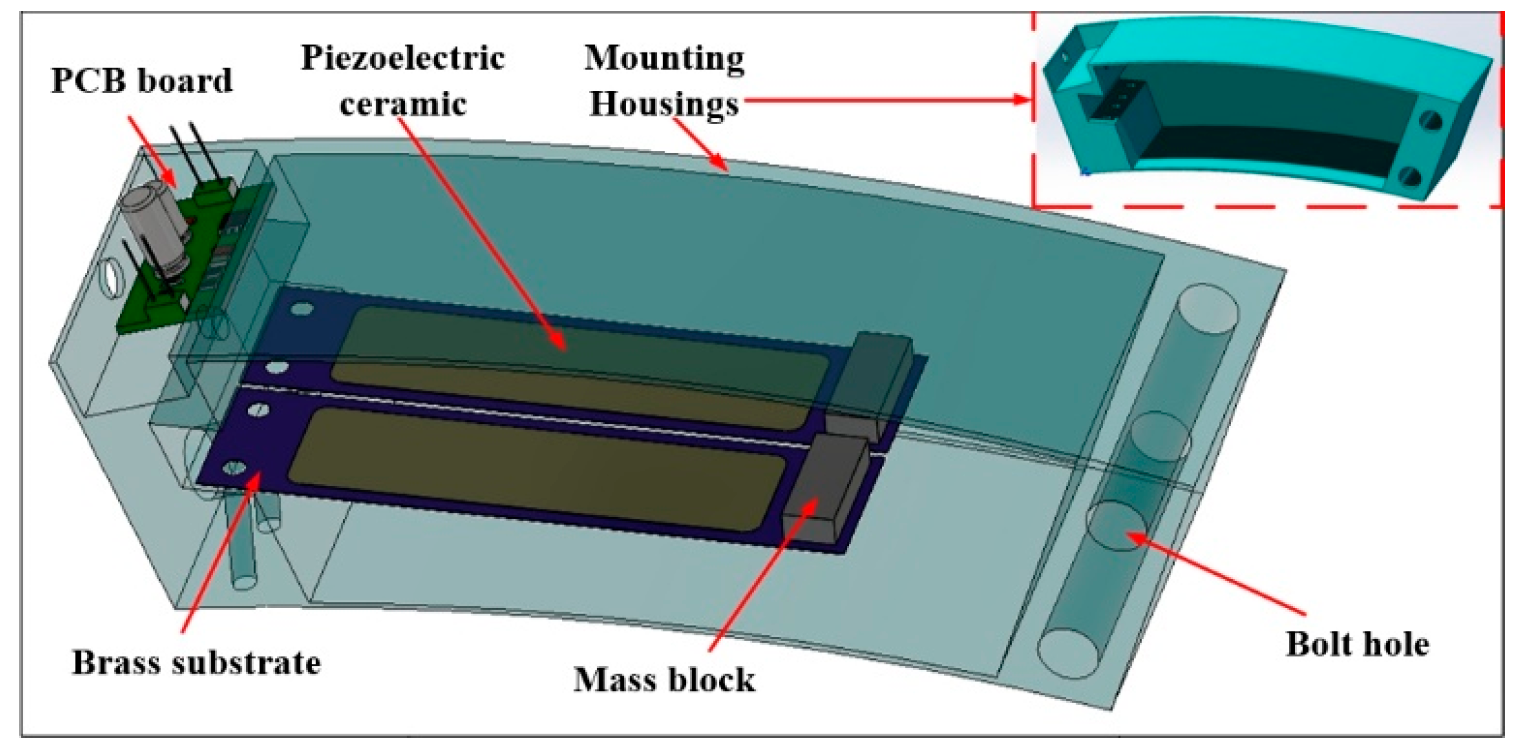 Figure 1, which is mainly composed of five parts: brass substrate, piezoelectric ceramic sheet, mounting shell, mass block, and PCB board. The piezoelectric ceramic is pasted on a brass substrate, and the fixed end of the brass substrate is solidly attached to the mounting housing with bolts and nuts to form a cantilever beam-type piezoelectric vibrator. The mass block is glued to the free end of the brass substrate with epoxy resin. Due to the limited amount of power generated by a single chip piezoelectric vibrator, two piezoelectric vibrators are connected in parallel to increase the power generation.