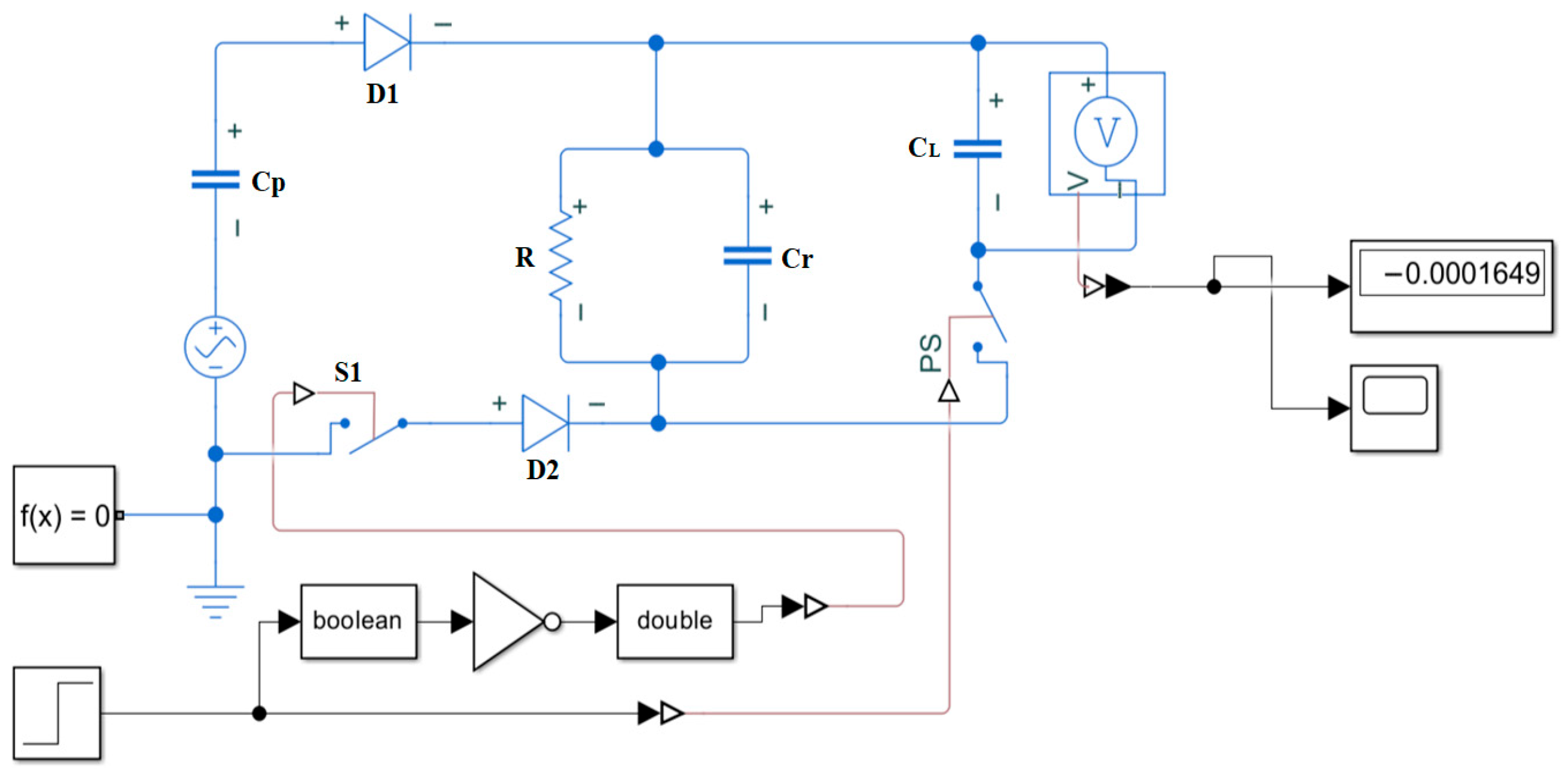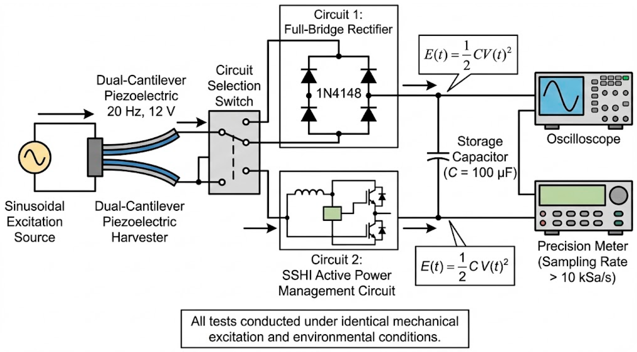 Figure 6, the energy flow originates from the sinusoidal excitation source, passes through the dual cantilever piezoelectric energy harvester, then traverses the switchable full-bridge rectifier circuit and SSHI circuit, ultimately converging into the energy storage capacitor. By selecting the circuit switch, the energy harvester’s output can be connected to either a traditional bridge rectifier circuit (1N4148 diode) or a synchronous switch energy harvesting (SSH) active power management circuit, without altering any mechanical excitation conditions. This switching method ensures that both circuits can operate under identical input conditions, eliminating uncertainties arising from variations in mechanical excitation during repeated experiments.