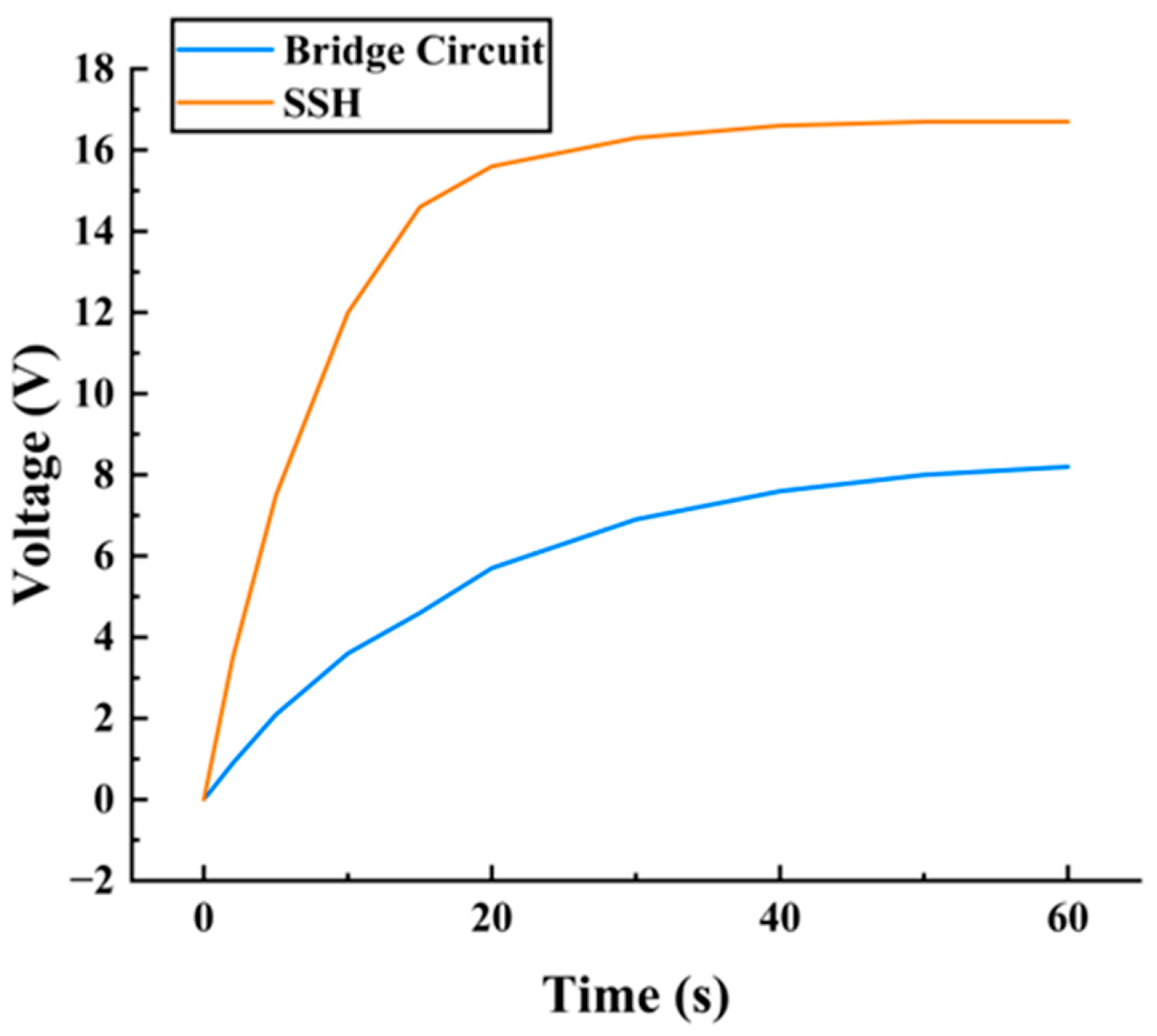 It can be seen that under identical excitation conditions, the output voltage of the SSH circuit is approximately twice that of the bridge rectifier, with output power increasing by about 218%, demonstrating a significant advantage in energy extraction.