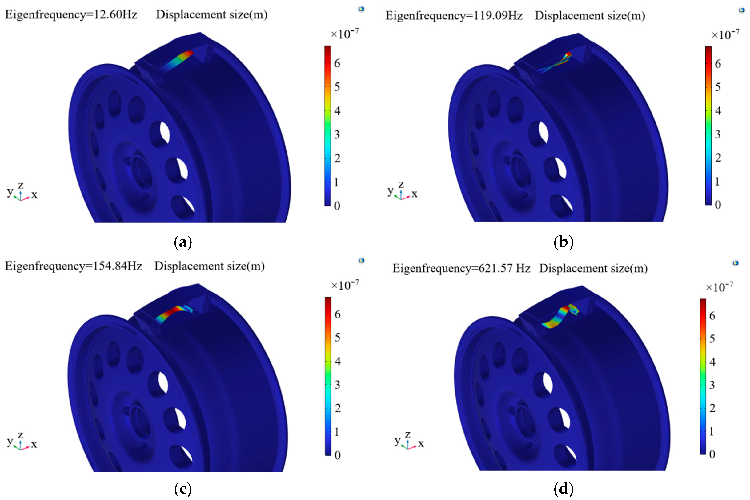 Figure 8, the first four modes of the piezoelectric harvester had frequencies of 12.60 Hz, 119.09 Hz, 154.84 Hz, and 621.57 Hz. The first-order vibration modes were consistent with the motion of the piezoelectric vibrator, while the second-, third-, and fourth-order modes did not conform to the tendency of piezoelectric vibrator motion, affecting the service life of the piezoelectric harvester.