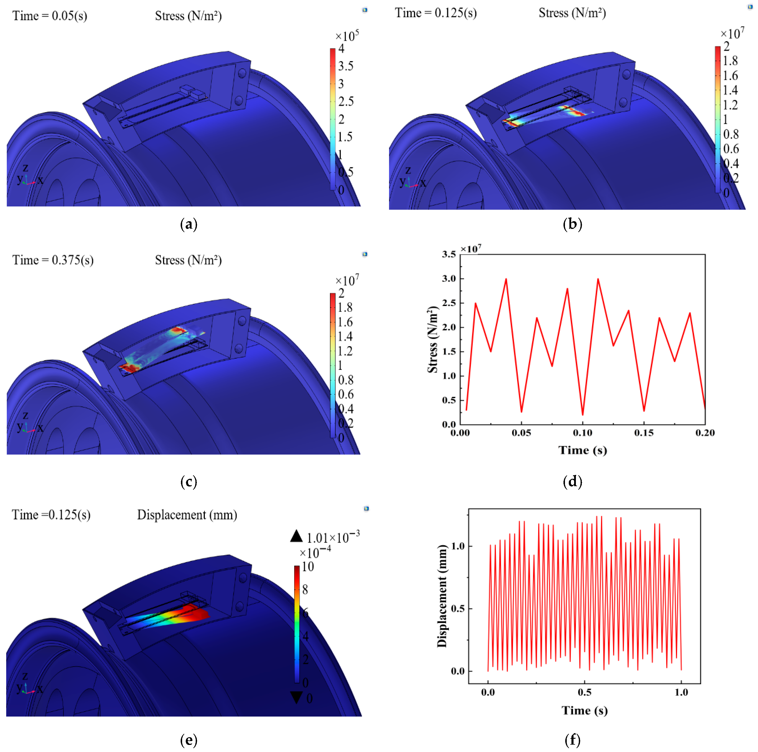 Figure 9, in 0~0.2 s, the maximum stress generated by the piezoelectric harvester was 30.6 MPa, which is less than the permissible stress of the selected materials of the equipment. This indicates that the piezoelectric harvester is in a safe range during normal operation and will not produce the phenomenon of stress yielding and damage fracture. The average output displacement of the piezoelectric harvester was 1.09 mm, and the average output voltage was 13.49 V in 0–1 s. The average output voltage of the piezoelectric harvester was 13.49 V. The displacement and output voltage of the piezoelectric harvester reached the maximum values of 1.24 mm and 14.9 V, respectively, at 0.58 s. The piezoelectric harvester generated the best power when piezoelectric vibrator deformation was maximized.