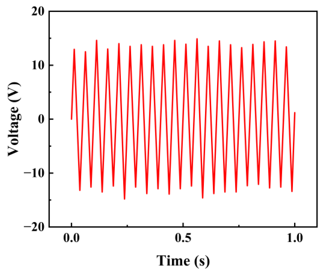 Secondly, a sinusoidal excitation signal with a frequency of 20 Hz and an amplitude of 12 V was applied to the piezoelectric harvester with an attached mass block of 10 g and a piezoelectric vibrator specific thickness ratio of 0.4 to study the stress–strain characteristics and the voltage output characteristics of the piezoelectric harvester in the working process. The simulation results are shown in