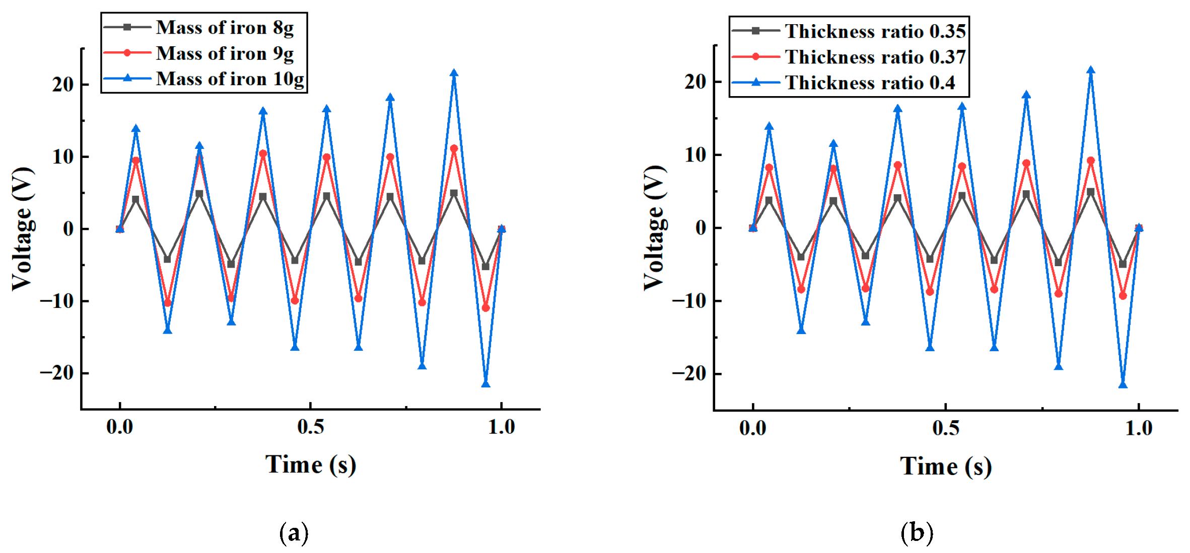 Table 2. The heavier the mass of the additional mass block, the better the power generation performance of the piezoelectric captor. This is because greater deformation of the piezoelectric vibrator during vibration results in more power generation. This is consistent with the results of the simulation and theoretical analysis.