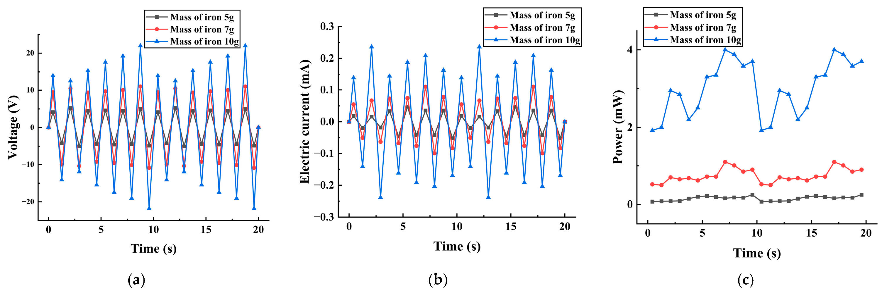 The piezoelectric energy harvester was fixed on the shaker. The signal generator output a sinusoidal excitation signal with a frequency of 20 Hz and an amplitude of 12 V, which was processed by the power amplifier and inputted to the shaker. The output was connected to an oscilloscope to measure the output voltage of the piezoelectric vibrator. The piezoelectric vibrator with 5 g, 7 g, and 10 g mass blocks attached was tested experimentally for power generation capability, respectively. The output voltage, output current, and output power are shown in