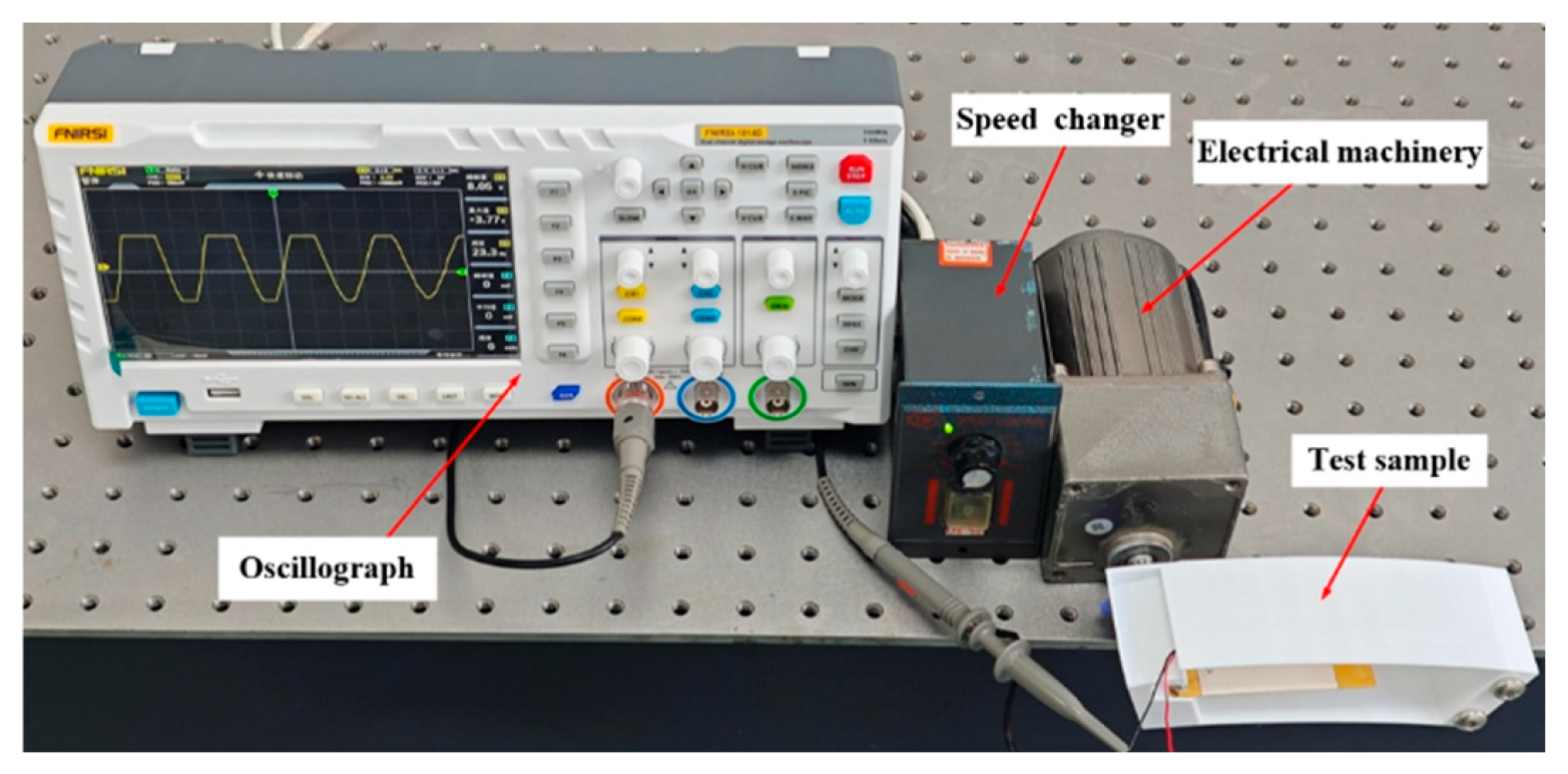 Figure 14. The experimental setup included a motor, transmission, oscilloscope (RIGOL-DS1102, manufactured by RIGOL Precision Electronics Technology Co., Ltd., Suzhou, China), and piezoelectric energy harvester experimental prototype. The piezoelectric energy harvester was mounted on the motor, and the speed of the motor was changed by the transmission and controlled in the range of 10–90 km/h for experimental testing. The effects of different speeds on the output voltage are shown in