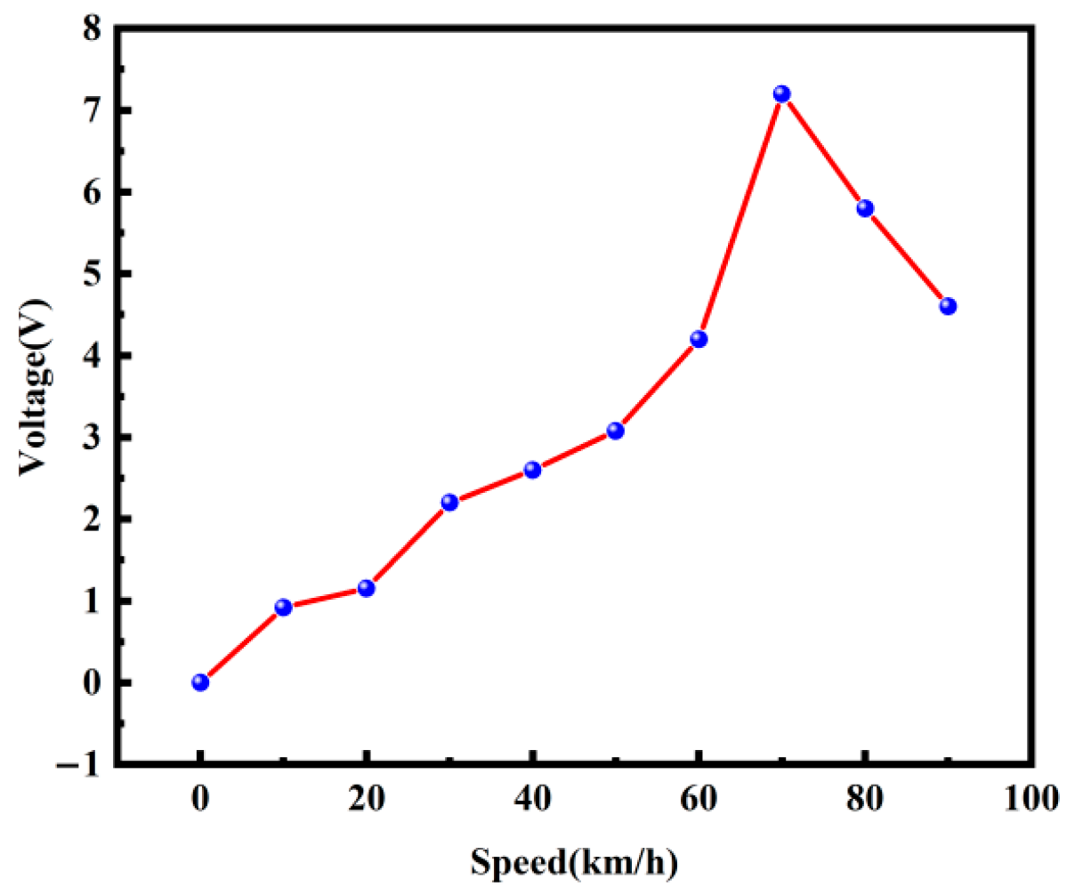 Figure 15, the output voltage of the piezoelectric captor increased and then decreased with different vehicle speeds. When the vehicle speed was 70 km/h, its output voltage reached 6.86 V, which is the best performance of power generation at this time. By analyzing the output voltage of the piezoelectric harvester installed in the shaker and motor, an experimental phenomenon was observed. When the shaker was used as the power source, piezoelectric harvester operated at a low frequency, the vibration amplitude was larger, leading to higher piezoelectric vibrator deformation and generating more surface charge; when the motor was used as the power source, the vibration amplitude of the piezoelectric vibrator was smaller, generating less surface charge.