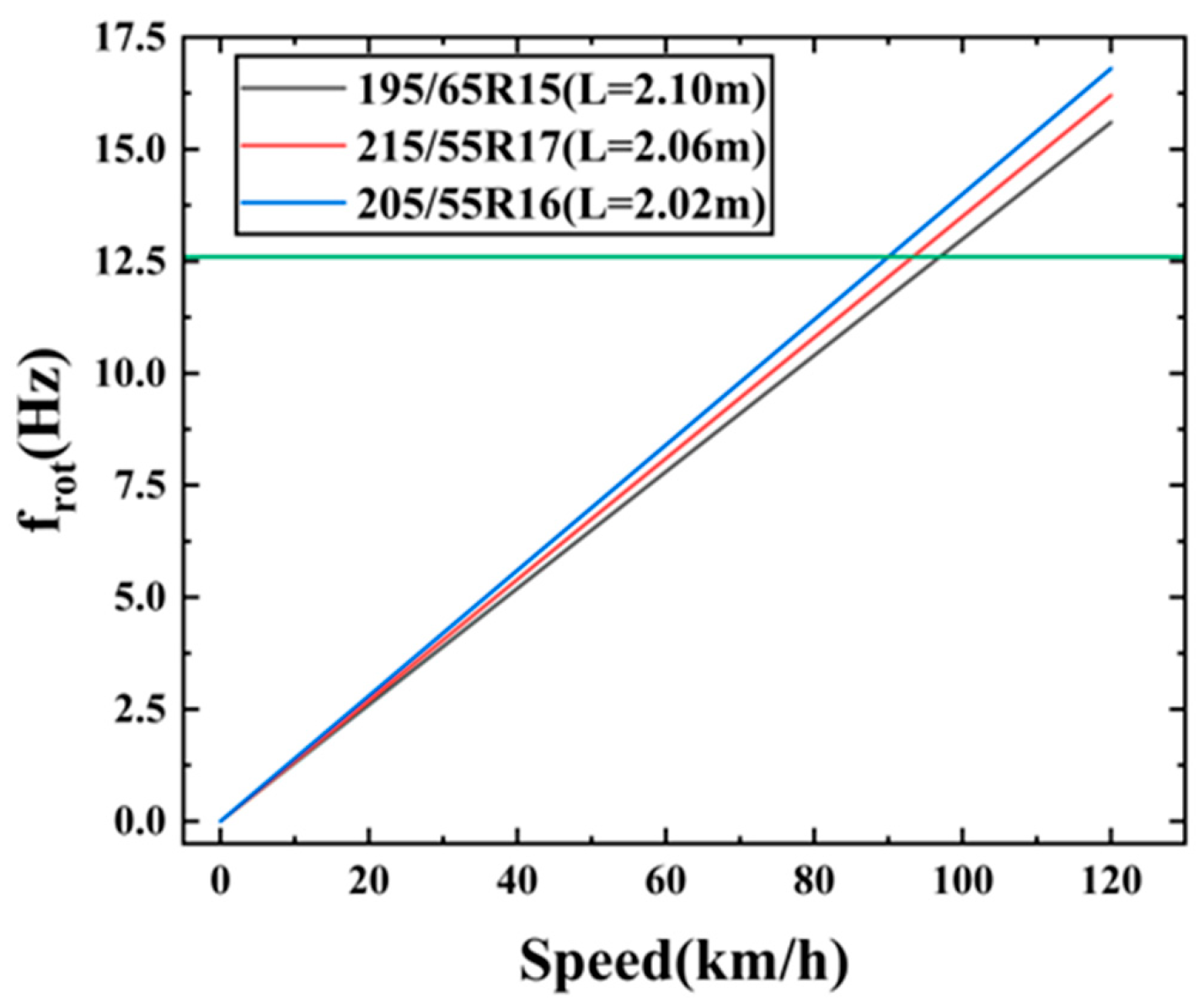 (i.e., the fundamental excitation frequency caused by each revolution of the tire) and analyze resonance between the natural frequency and excitation frequency to demonstrate the accuracy of the experiment: