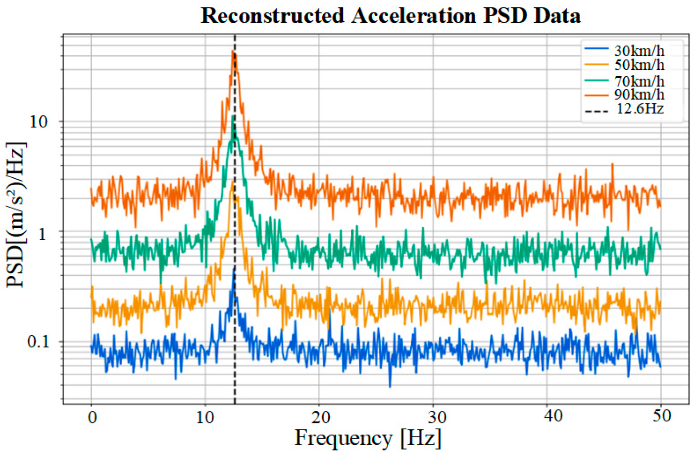Figure 17, under 70 km/h conditions, the tire–rim acceleration PSD exhibited a distinct peak in the 12.5–12.7 Hz range, precisely coinciding with the first-order modal frequency of the energy absorber. This explains the experimentally observed optimal output performance at 70 km/h.