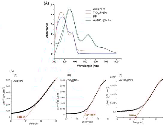 (A) UV Visible spectra of Punica granatum (PP), Au@NPs, TiO2@NPs, and AuTiO2@NPs in the wavelength range of 200–800 nm; and (B) Tauc plot of the (αhν)2 versus hν plots: (a) Au@NPs, (b) TiO2@NPs, and (c) AuTiO2@NPs.