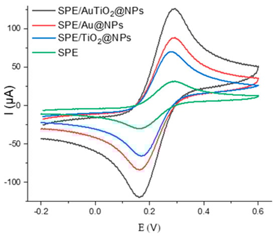 Building on the physicochemical properties of the synthesized nanomaterials of Au@NPs, TiO2@NPs, and AuTiO2@NPs nanoparticles and to ensure a more comparative investigation concerning the properties of monometallic and bimetallic nanoparticles in the enhancement of electrochemical signal, three different electrochemical sensors were developed by functionalizing screen-printed electrodes (SPGEs) with these nanomaterials. The electrochemical behavior of the electrodes, both before and after surface modification, was evaluated in a 0.1 M phosphate-buffered saline (PBS, pH 7.4) solution containing 5 mM of the redox couple [Fe(CN)6]3−/4−. To assess the electron transfer capability and electrical conductivity of the modified electrodes, cyclic voltammetry (CV) was performed (Figure 3). The cyclic voltammograms revealed an increase in peak current for the different surface modifications with the green nanoparticle electrode compared to the bare SPGE, indicating enhanced electron transfer kinetics.