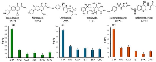 For better visualization, the current intensity variation for different sensors versus different CIP concentrations is presented in Figure 4b. A linear relationship was observed in the case of the different sensors, demonstrating the sensor’s capability for quantitative detection. Limits of detection (LOD), linear range, and sensitivity values for the different sensors are presented in Table 1.
