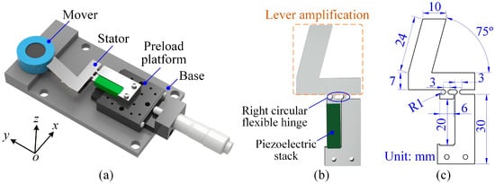 The detailed dimensions of the flexible hinge mechanism are shown in Figure 1c. The fixed end of the stator is designed according to the size of the piezoelectric stack. The dimensions of the lever amplification section are selected to balance displacement amplification and structural compactness. In addition, a 75° inclination angle is intentionally introduced so that the flexible hinge mechanism forms a parasitic-motion structure. This configuration enables the output tip to generate both a forward driving force along the x-direction and a preload component along the y-direction when contacting the mover, thereby promoting stable stick–slip motion.