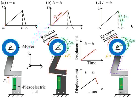 Figure 2. Motion principle of the stick–slip actuator. (a) Initial state with no voltage input. (b) Voltage gradually increases during the stick stage. (c) Voltage rapidly decreases during the slip stage.