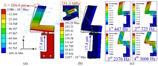 Figure 3. Finite element simulation results. (a) Total deformation corresponding to an input displacement of 17.4 μm. (b) Equivalent stress distribution corresponding to an input displacement of 17.4 μm. (c) First four mode shapes of the flexible hinge mechanism, with natural frequencies of 447 Hz, 725 Hz, 2376 Hz, and 3606 Hz, respectively.
