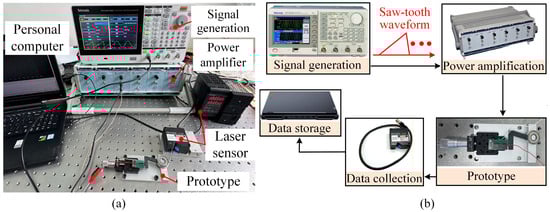 To maintain the reliability and precision of the test results, all experiments were carried out under controlled conditions. As shown in Figure 4a, the experimental platform consisted of five main components: the actuator prototype, a laser displacement sensor (LK-H020, KEYENCE, Osaka, Japan), a function generator (AFG3022C, Tektronix, Beaverton, OR, USA), a power amplifier (E00A6, Core Morrow, Harbin, China), and a personal computer for data processing. The entire setup was placed on an air-floating vibration isolation platform to minimize the influence of environmental vibrations, thereby reducing measurement uncertainty caused by external disturbances. The displacement of the mover was measured using the laser displacement sensor with a resolution of 10 nm. The sampling frequency was set to 20 kHz, which is sufficient to capture the actuator motion at the maximum driving frequency used in this study. The displacement signals were recorded at this high sampling rate and directly used for subsequent data analysis without additional digital filtering. A precision stage was used for alignment to ensure that the sensor measured along the correct axis. All experiments were conducted under normal laboratory conditions at room temperature (approximately 23 ± 1 °C) and moderate relative humidity.