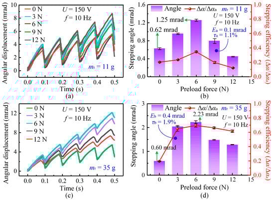 Figure 5. Influence of preload force and mover mass on the stepping characteristics of the actuator at 150 V and 10 Hz. (a) Angular displacement curves under different preload forces for the 11 g mover. (b) Variation in stepping angle and stepping efficiency with preload force for the 11 g mover. (c) Angular displacement curves under different preload forces for the 35 g mover. (d) Variation in stepping angle and stepping efficiency with preload force for the 35 g mover.