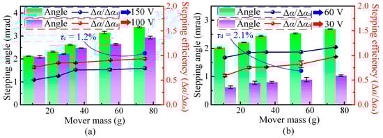 Figure 7. Influence of mover mass on stepping performance under different driving voltages. (a) Stepping angle and stepping efficiency at 150 V and 100 V. (b) Stepping angle and stepping efficiency at 60 V and 30 V.