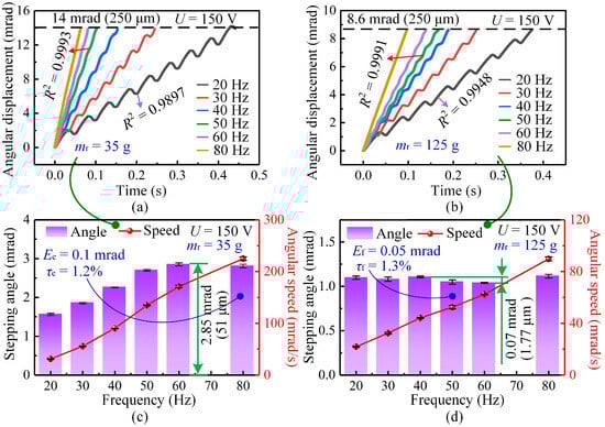 Figure 8. Variation in stepping characteristics with driving frequency under a driving voltage of 150 V. (a) Angular displacement curves at different frequencies for a mover mass of 35 g. (b) Angular displacement curves at different frequencies for a mover mass of 125 g. (c) Influence of driving frequency on the stepping angle and angular speed for a 35 g mover. (d) Influence of driving frequency on the stepping angle and angular speed for a 125 g mover.