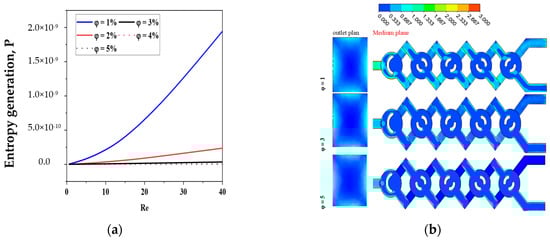 For a certain Reynolds number Re = 10, Figure 16 shows how various nanofluid concentration values φ = 1, 3, and 5 affect the local distributions of entropy production owing to heat transfer . In the other locations, is almost negligible, but in the corner of the micromixer, there is a distribution of considerable entropy formation owing to heat transfer. Entropy development due to heat transmission is almost nil in other locations and concentrated in a narrow layer next to the wall for all geometries of nanofluids. When the concentration of nanofluids is small, the Reynolds number law generates the most entropy. Nevertheless, in every instance, the formation of entropy owing to fluid friction is much more than that due to heat transfer, suggesting that, under the present flow circumstances, fluid friction irreversibility dominates entropy generation. Hence, improved work performance would result from a fluid system with a low φ and a high Re.