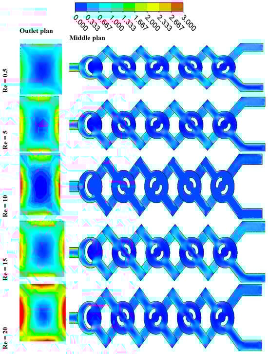 For various nano concentrations, = 1, 3 and 5% and Reynolds numbers Re = 5–25, Figure 4 displays the secondary flows in the middle planes. At low Reynolds numbers (creeping flows), the velocity contours still show two big vortices forming in the micromixer, as well as the junction of secondary flows in the plane coming from the top and bottom of the channel. Two fluid jets colliding is the best way to describe the incoming flows that meet. Even at low concentrations, fluid jets significantly improve mixing very quickly.