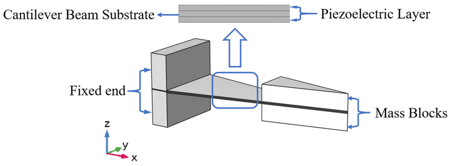 While cantilever-beam piezoelectric energy harvesters (PEHs) offer advantages in structural simplicity and fabrication convenience [13,30,31], their conventional homogeneous mass block designs face intrinsic limitations in energy conversion efficiency [32,33,34]. The present study proposes a parametric optimization framework for the mass block structure and cantilever substrate based on the standard PEH architecture. A three-dimensional multiphysics coupling model is employed to systematically elucidate the impact of structural optimization on electromechanical performance. Additionally, a comparison is made between the output characteristics of the conventional and optimized structures. The results demonstrate that the optimized energy harvester structure effectively improves the stress distribution within the piezoelectric elements, thereby enhancing the piezoelectric effect. This, in turn, results in a substantial improvement in the harvester’s output performance and an increase in electromechanical conversion efficiency.