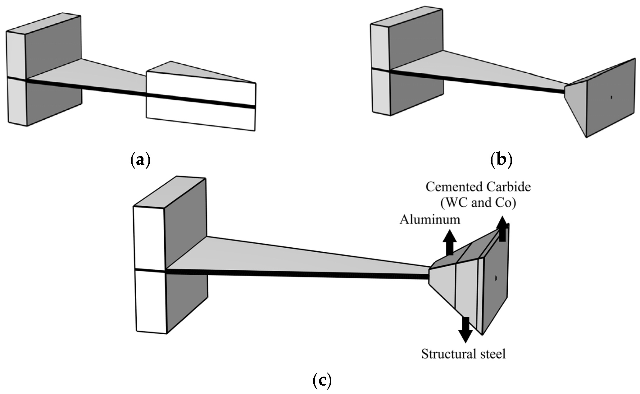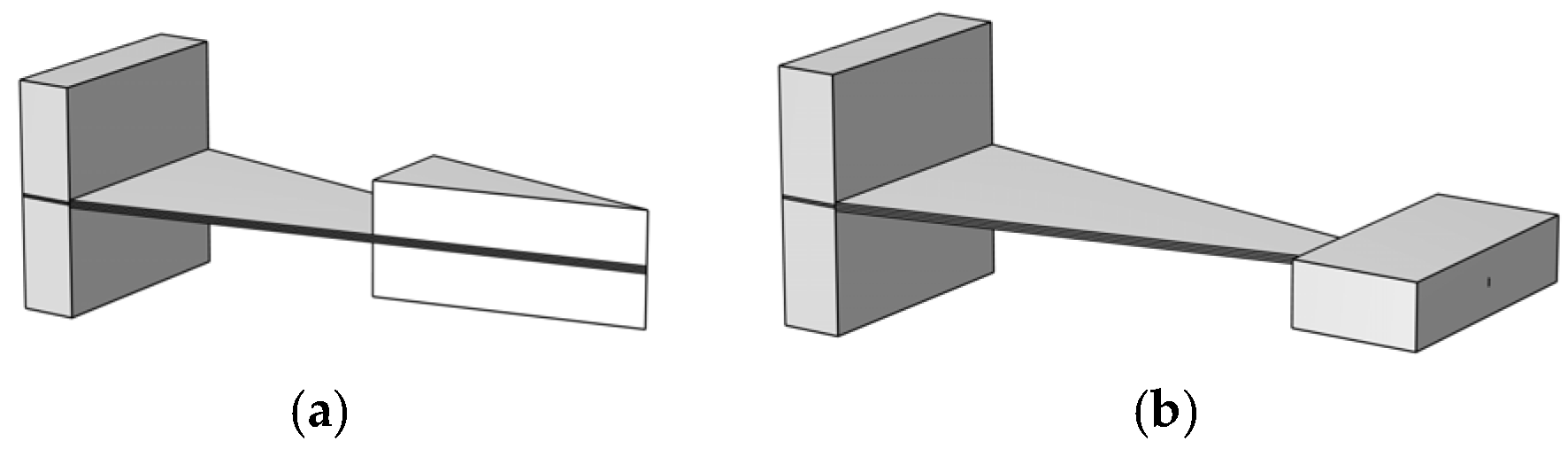 This study utilizes an embedded coupling method to connect the mass block with the cantilever beam, thereby addressing the prevalent issue of inadequate spatial utilization in the end region of conventional triangular cantilever beams. As demonstrated in Figure 3b, this composite structure establishes a geometrically matched cavity within the core region of the mass block. The free end of the triangular cantilever beam is embedded into this cavity, thereby creating an embedded coupling system between the mass block and the cantilever beam. Furthermore, the mass block of Structure Ⅱ undergoes a transformation from a triangular to a rectangular configuration. The two mass blocks possess equal weight and identical material properties, exhibiting a symmetrical configuration about the centerline of the base plate. The apex of the triangular cantilever beam in Structure Ⅱ is located at the center of the mass block’s cross-section.