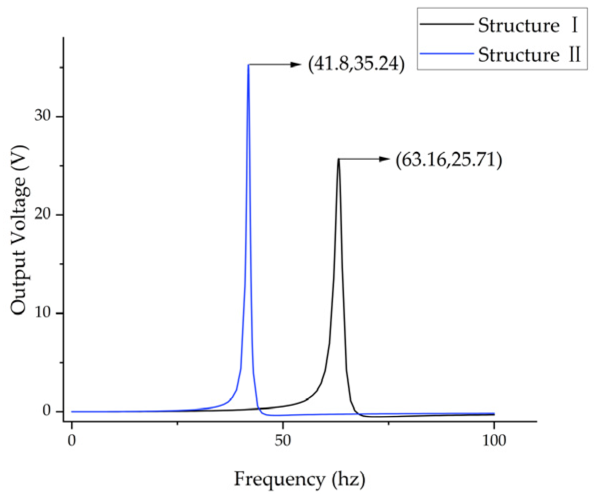 By calculating the center of gravity position of the mass blocks, the output voltage sensitivity coefficients of Structure Ⅱ and Structure Ⅲ can be obtained as 2.505 V/mm and 2.03 V/mm, respectively, from which it can be observed that Structure Ⅱ is a more superior structure. A comparative analysis reveals that structures with width differences (Structures II–IV) will effectively extend the force arm lengths and generate larger bending strains under the same excitation. It is important to note that, while achieving performance optimization, the stress distribution curves and maximum stress values of Structure II remain comparable to those of Structure I. This demonstrates that Structure II does not impose an additional stress burden on the cantilever beams. Furthermore, this morphological reconfiguration does not introduce the risk of localized stress concentration, which contributes to prolonging the service life of the cantilever beams.