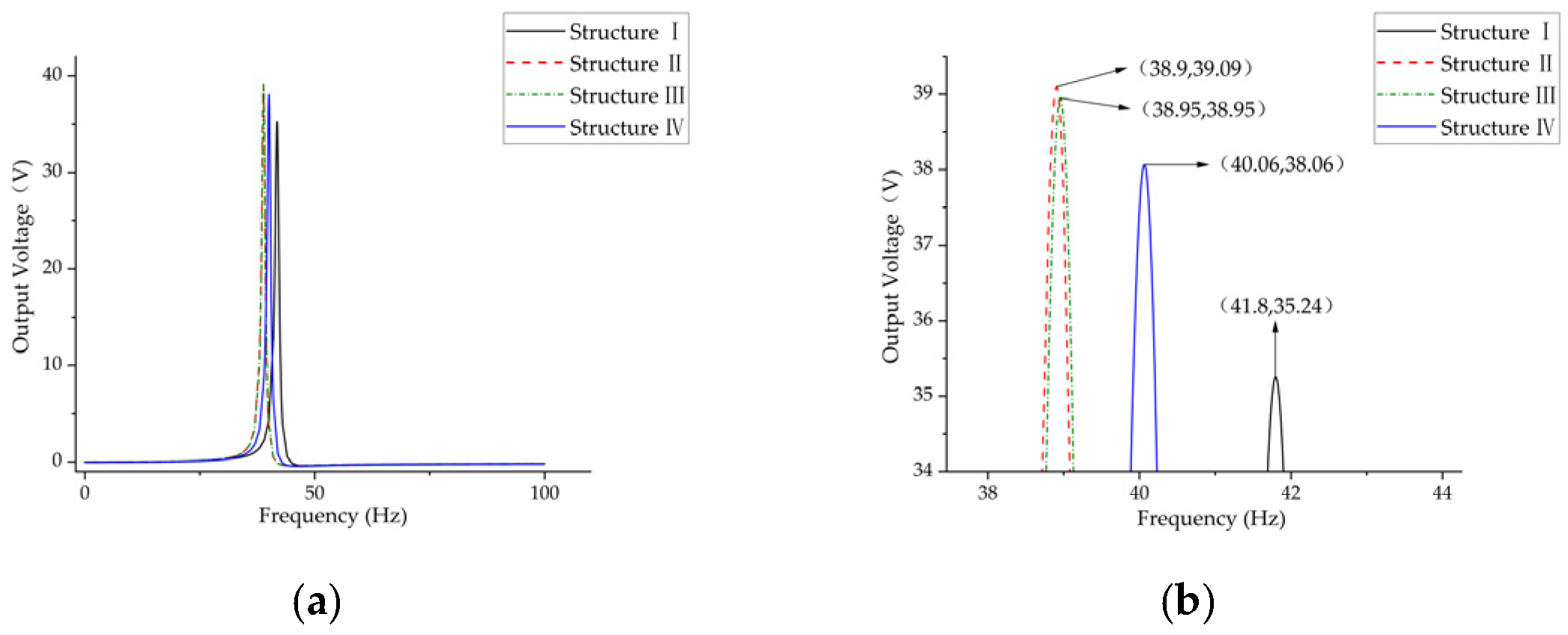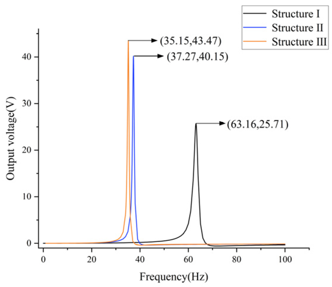 As demonstrated in Figure 7, the optimized structures exhibit superior output performance in comparison to structure I. The voltage and first-order natural frequency of structure I are recorded as 35.24 V and 41.8 Hz. Structure III demonstrates the least enhancement in performance, exhibiting an 8% rise in voltage (from 35.24 V to 38.06 V) and a 4.1% decline in natural frequency. The output curves of structures II (39.09 V, 38.9 Hz) and structures III (38.95 V, 38.9 Hz) exhibit a significant degree of overlap; however, it is evident that structure II possesses a higher output voltage and a lower intrinsic frequency. The findings of the present study demonstrate that, while maintaining constant parameters such as volume, contact area, and width, Structure II exhibits an augmentation in output voltage of 10.9% (35.24 V to 39.09 V) and a reduction in first-order natural frequency of 6.9% (38.9 Hz to 41.8 Hz) in comparison to Structure I.