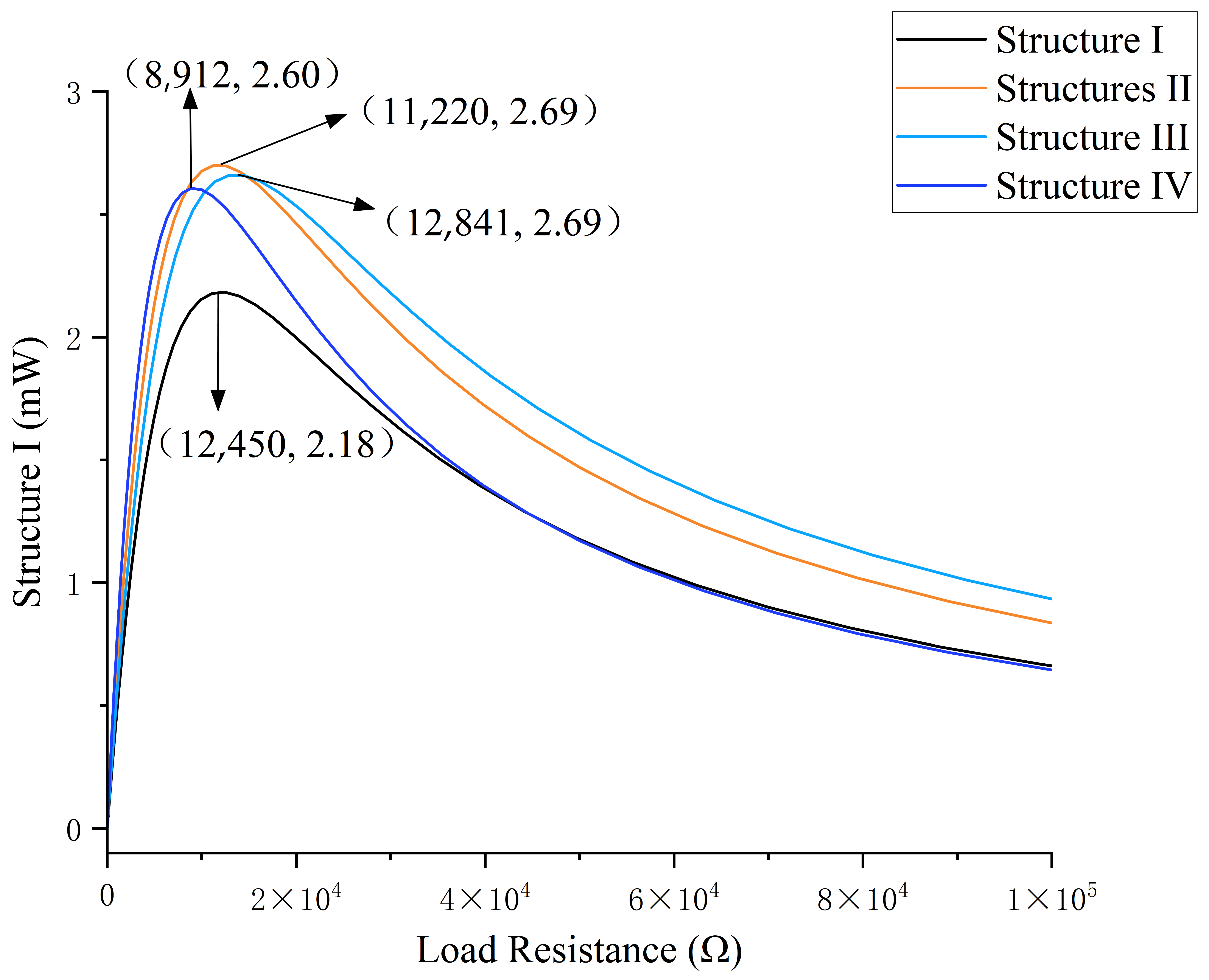 As demonstrated in Figure 8, the variation in output power of four distinct piezoelectric energy harvesters (Structures I–IV) is depicted as a function of load resistance. All structures manifest a distinctive single-peak curve characteristic, whereby output power escalates swiftly as load resistance ascends, attains a maximum value (peak power), and subsequently declines gradually as resistance persists in its increase. Structure Ⅰ demonstrated the poorest performance, achieving a peak power of 2.18 mW at 12,450 Ω. Conversely, Structure Ⅱ exhibited the optimal performance, reaching a peak power of 2.69 mW at 11,220 Ω. Structure Ⅲ demonstrates a reduced peak power output in comparison to Structure Ⅱ. However, beyond 20,000 Ω, Structure Ⅲ exhibits a marginal increase in power output relative to Structure Ⅱ. At maximum power output, the load resistance experienced by Structure Ⅳ is minimal. However, as the load increases, the rate of power decay accelerates rapidly. Beyond 35,000 Ω, the curve essentially overlaps with that of Structure Ⅰ.