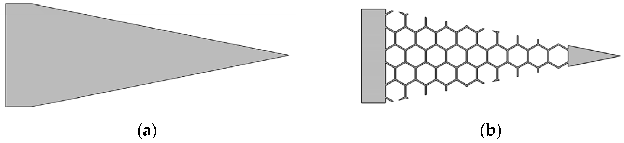 A honeycomb structure with a negative Poisson ratio is composed of regular hexagonal cells, as illustrated in Figure 10b.