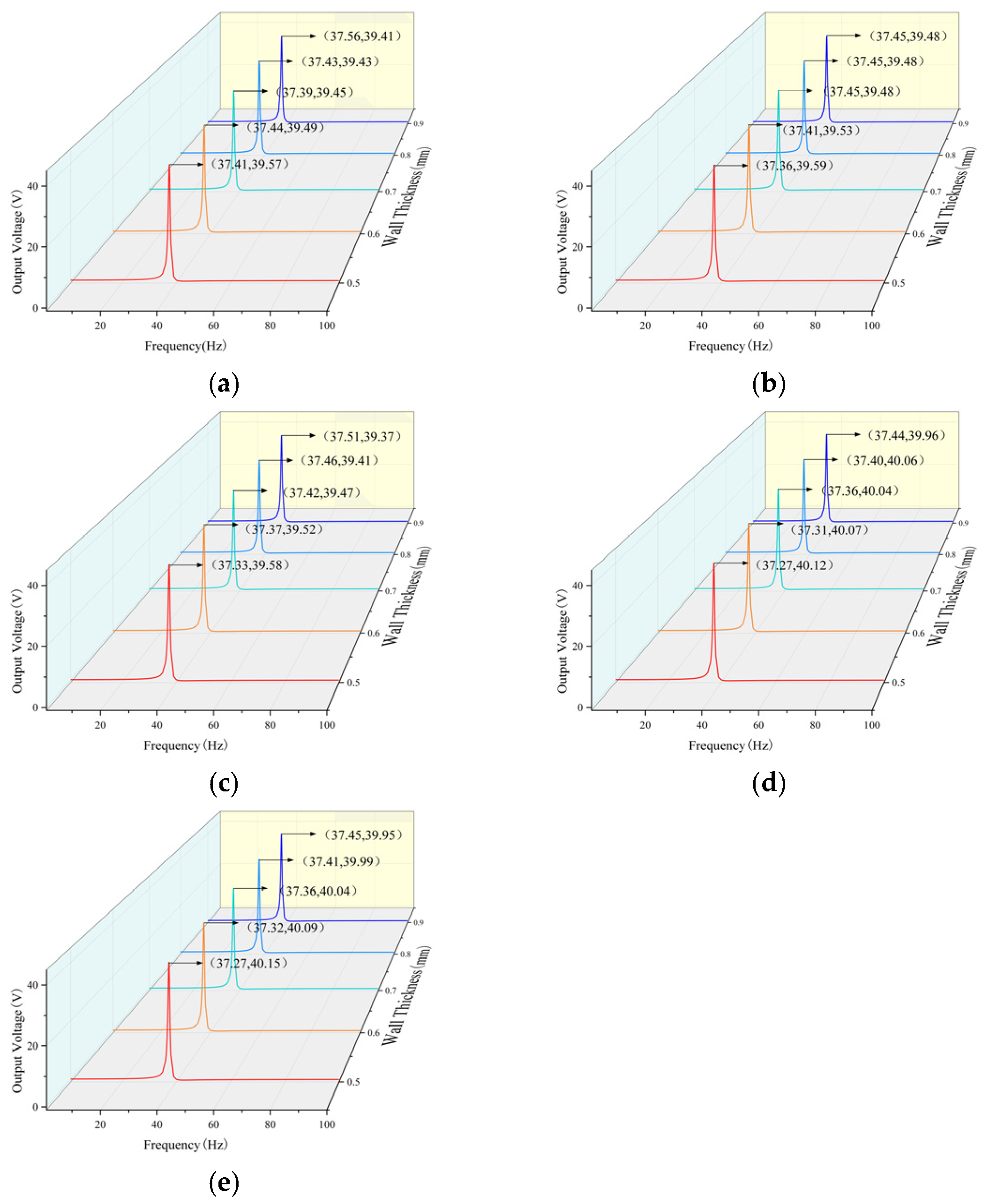 An analysis of the data reveals that the first-order natural frequency and peak voltage of the curves in the image exceed those of the flat plate structure. Consequently, the hexagonal negative Poisson’s ratio cantilever beam structure exhibits a substantial optimization effect on the output voltage of the energy harvester. A comparative analysis of multiple diagrams reveals two distinct patterns. It has been demonstrated that, given a constant unit length, the first-order natural frequency increases in proportion to the increase in unit wall thickness. Conversely, the maximum output voltage decreases in proportion to the increase in unit wall thickness.