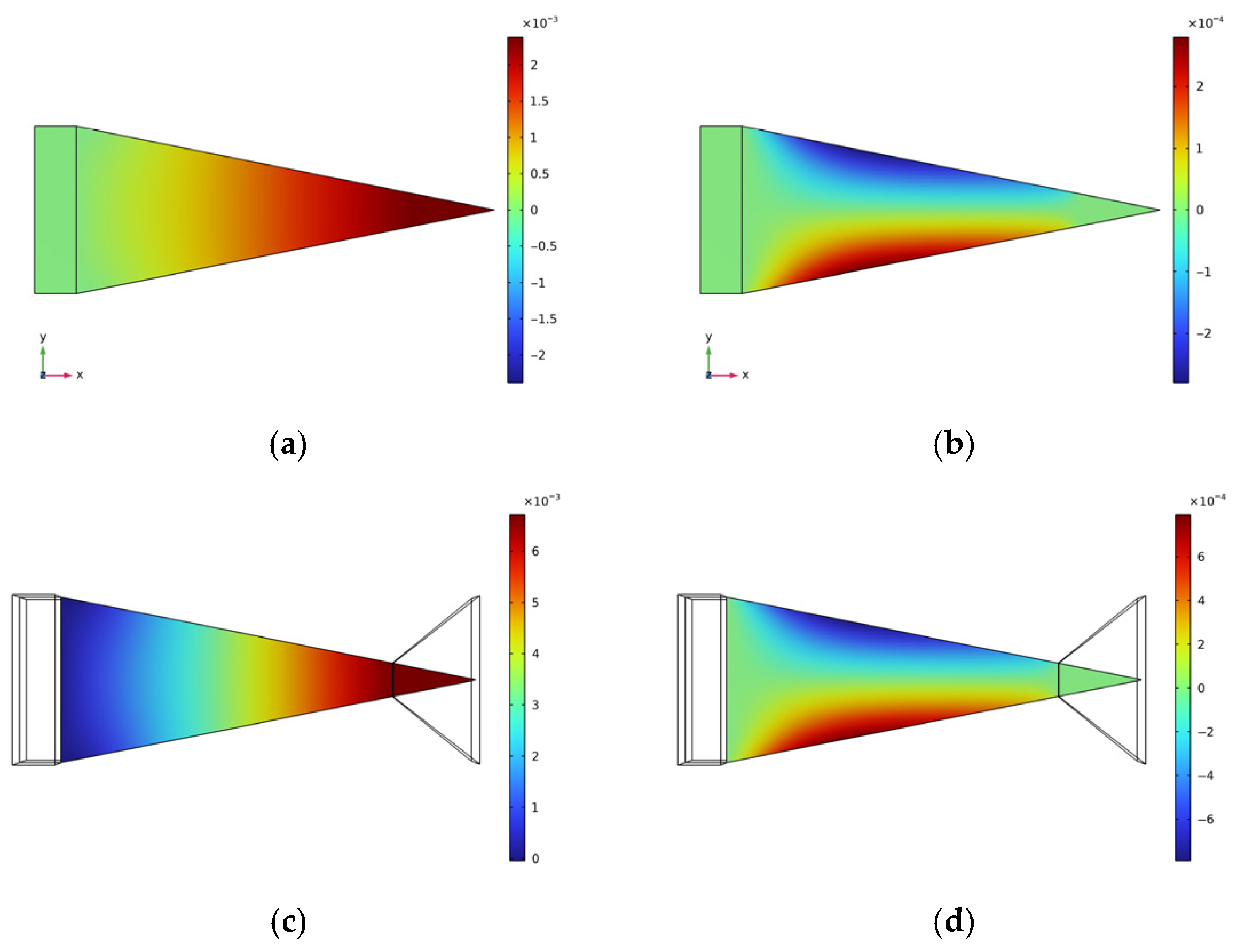 Figure 12. Flat plate structure displacement diagram. (a) Axial displacement of the cantilever beam substrate along the X-axis; (b) Axial displacement of the cantilever beam substrate along the Y-axis; (c) Piezoelectric sheet X-axis displacement; (d) Piezoelectric sheet Y-axis displacement.