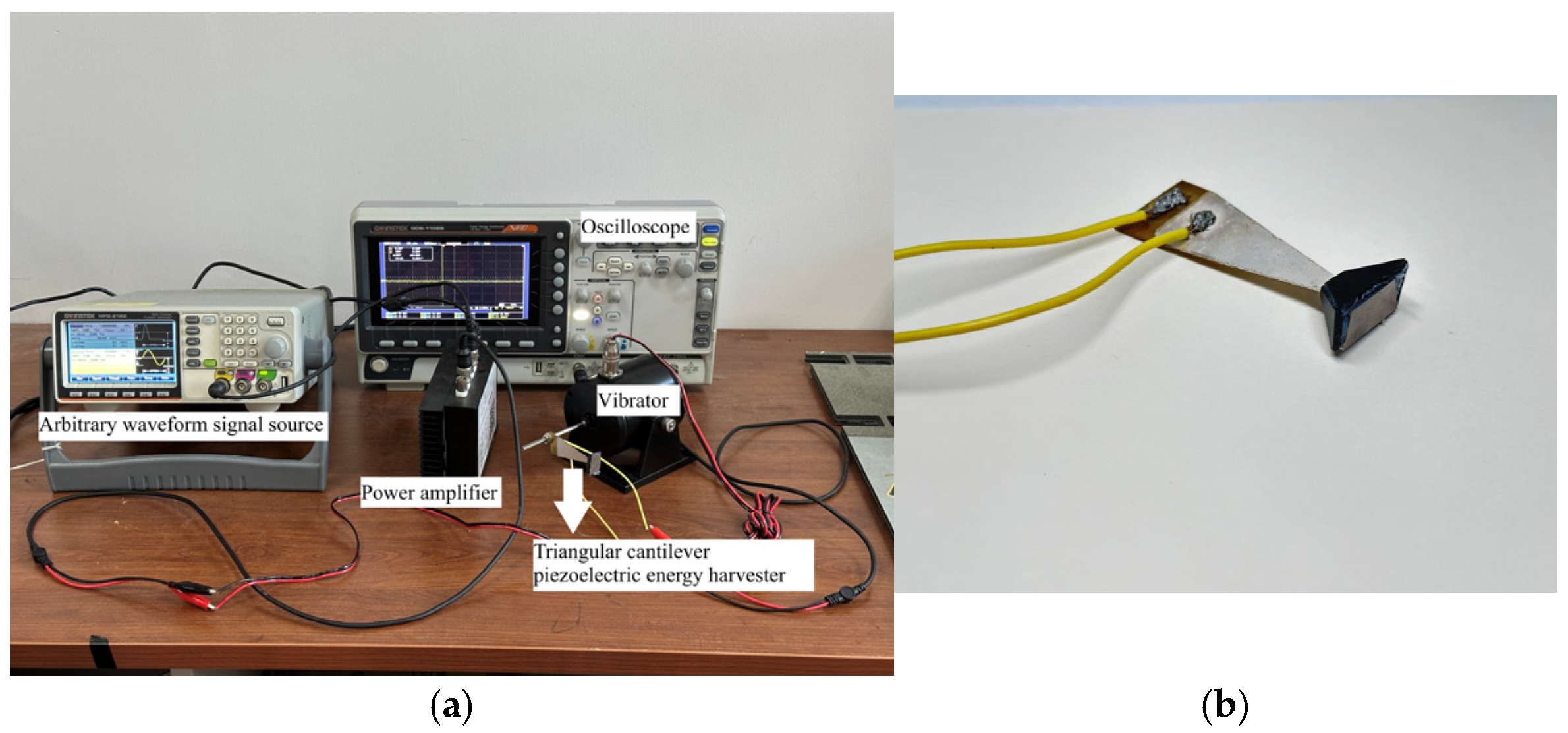 For measurement instrumentation, the output voltage of the piezoelectric energy harvester is measured through a load resistor of known resistance, set at 12 kΩ to match the simulation parameters. The voltage across the resistor is measured using an oscilloscope (GOS-11028, GwinStek, Suzhou, China). The device under consideration provides a 100-megahertz bandwidth and a sampling rate of 1 gigahertz per second, which is considerably higher than the highest frequency of the signal.