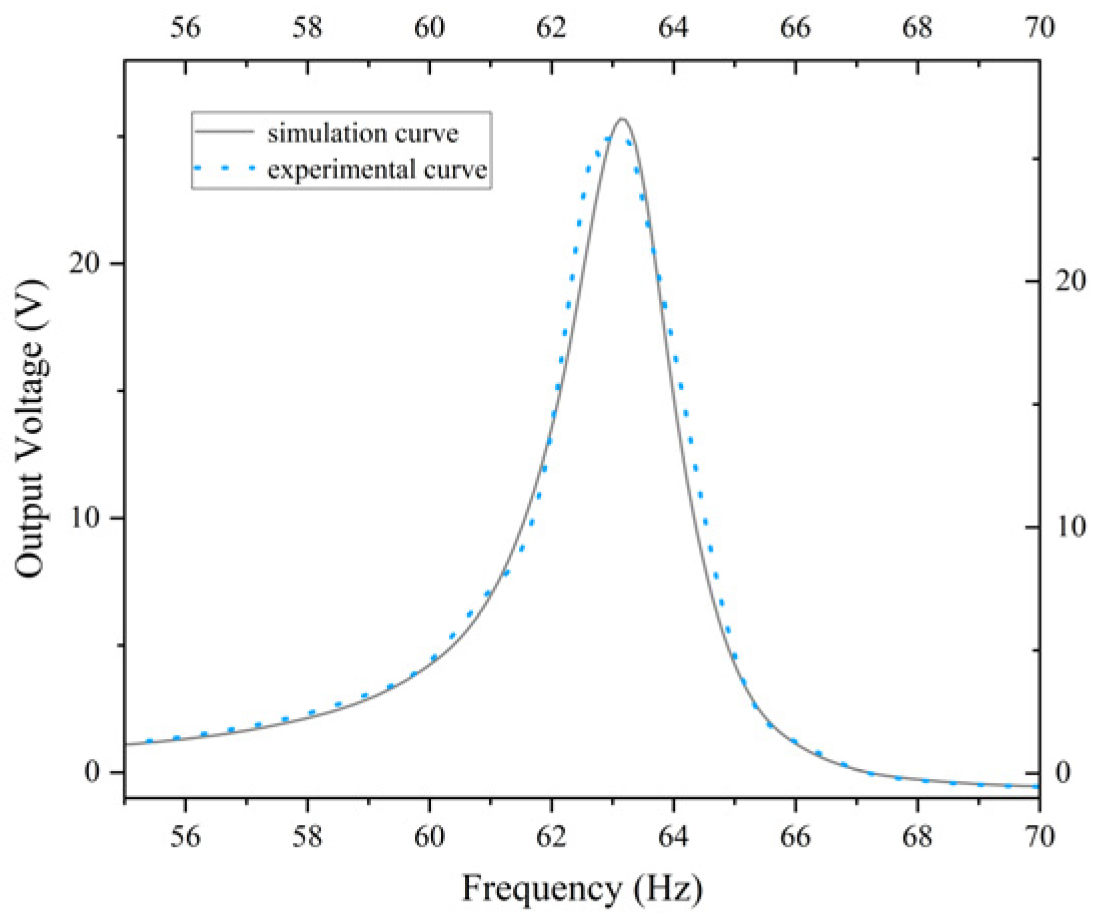 The experimental verification section of the study involved the use of a physical test platform to obtain actual measurement data for the prototype. According to the experimental results, the optimized energy harvester demonstrated a 71.26% increase in output voltage compared to the standard energy harvester. The voltage-frequency characteristic curve of the optimized energy harvester exhibited a high degree of consistency within the 31–37 Hz range, with a relative error of less than 3%, thereby substantiating the reliability of the simulation model. Furthermore, the output power of the optimized energy harvester exhibited attains a maximum of 3.3 mW at a load resistance of 16.4 kΩ, thereby substantiating the viability of the optimized structure in practical applications.