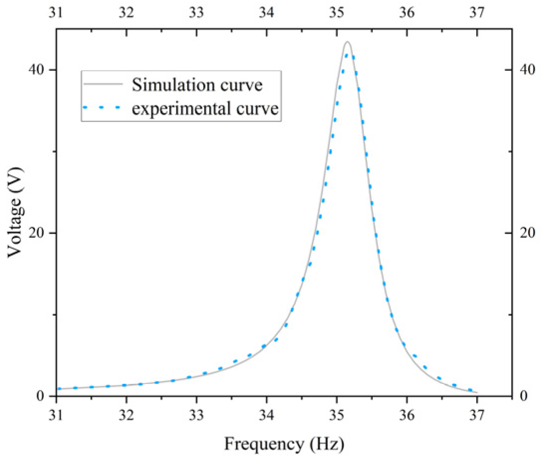 The objective of this study is to ascertain the validity of the theoretical model by comparing the voltage-frequency characteristic curves obtained from simulation and experiment. As illustrated in Figure 17, the simulated and experimental curves for the standard energy harvester constructed based on Figure 14a are presented. It is evident that the simulated curve exhibits a strong alignment with the experimental curve, with peak errors amounting to approximately 4.5%. As illustrated in Figure 18, the simulated and experimental curves of the optimized energy harvester constructed based on Figure 14c are presented. As shown in Figure 18, the two curves demonstrate a high degree of consistency within the 31–37 Hz frequency range, with both reaching a maximum near 35 Hz and subsequently decaying gradually. The relative error between voltage and frequency remains below 3%, indicating the model’s high accuracy in predicting system responses. The calculations indicate that the optimized energy harvester delivers a 71.26% increase in output voltage compared to the standard energy harvester. The simulation curve demonstrates a strong correlation with the experimental curve in terms of overall shape and peak characteristics, thereby substantiating the reliability of the theoretical model. This finding indicates that the model is capable of effectively reflecting the system’s overall dynamic behavior. The congruence between the simulation and experimental results substantiates the efficacy of the theoretical model developed, thereby establishing a foundation for its applicability in pertinent engineering applications.