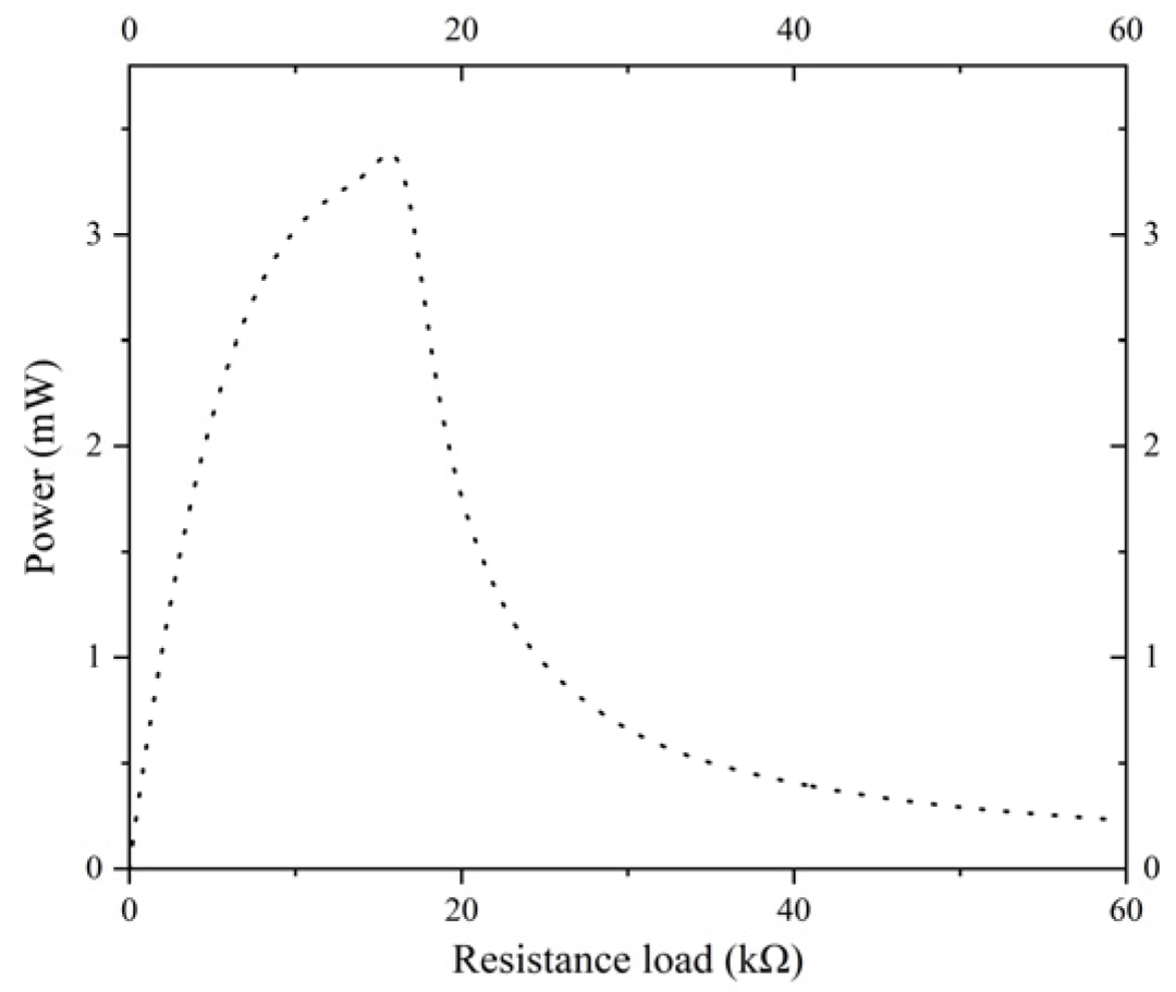 This Figure 19 illustrates the characteristic curve of the energy harvester’s output power as a function of external load resistance. The horizontal axis of the coordinate system denotes load resistance, while the vertical axis denotes output power. The curve displays a conventional single-peak characteristic. The output power reaches its maximum value of 3.3 mW at a load resistance of approximately 16.4 kΩ.